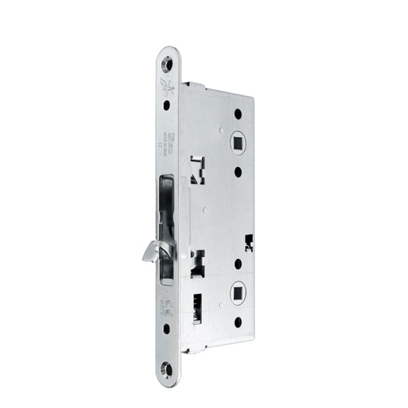 Mechanical lock for double leaf fire-resistant door secondary leaf with panic exit bar.